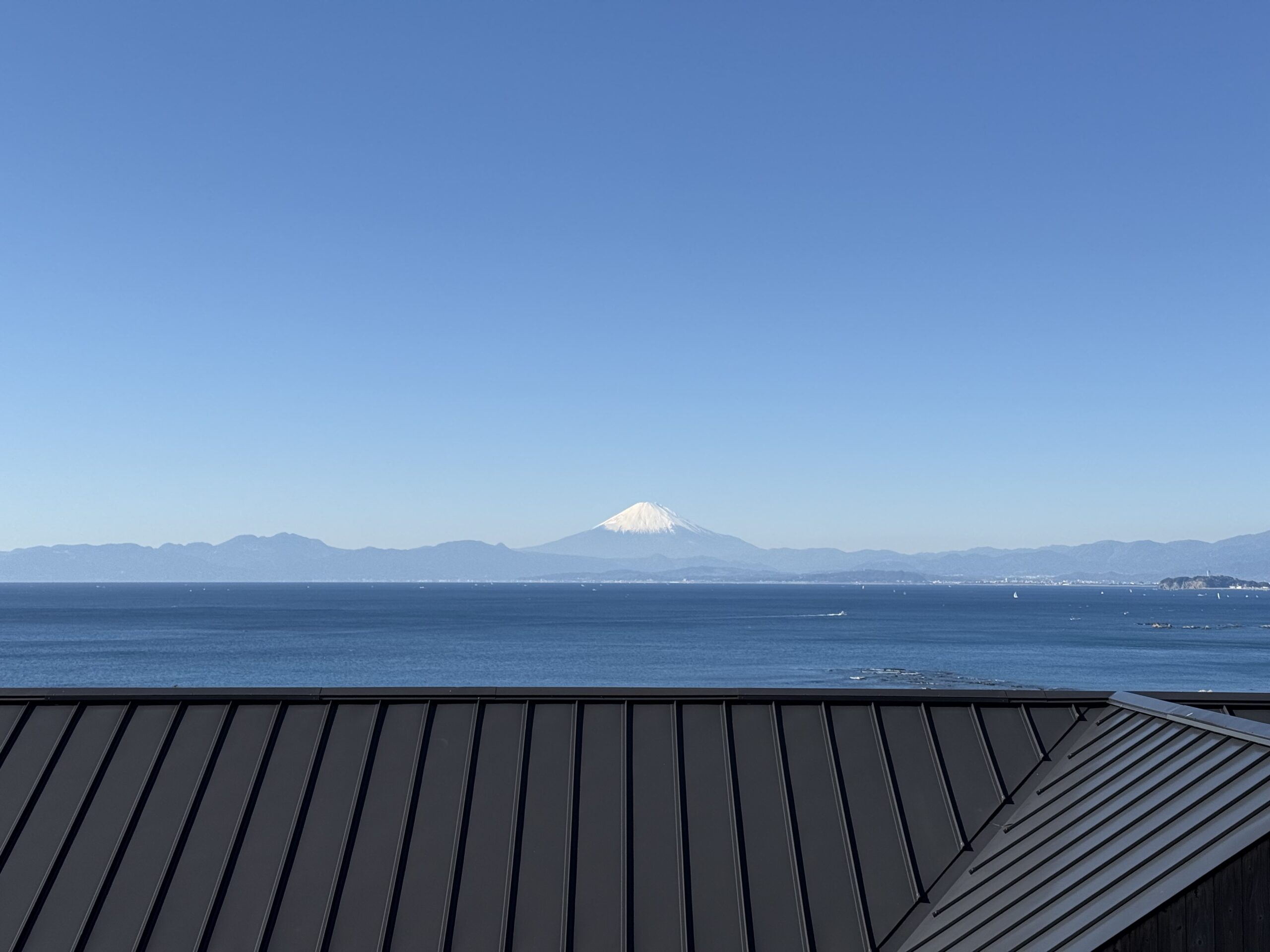 眺望は相模湾の水平線、その上に浮かぶ富士山と江の島。